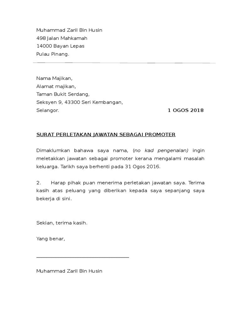 Btw, saya dah nak resign kerja bcoz of xda nak jaga baby baru lahir nur balqis wafiyyah (baru 2months). Bahasa melayu karangan format khas: Perlu menulis surat perletakan jawatan? Jujur dengan diri sendiri masa tulis surat perletakan jawatan. Ia merupakan contoh bagi semua jenis surat formal perletakan jawatan.